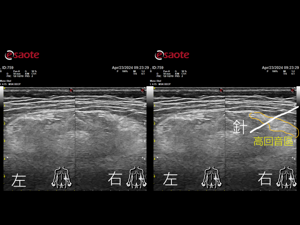 把超音波探頭放上去以後,哇哇哇~~~看到豎脊肌的表層筋膜有一大區塊出現了高反音反應。這個應該是之前有蠻嚴重的撕裂傷或發炎,在長時間的修復過程中造成的肌筋膜的纖維化甚至鈣化反應。通常這種纖維化的肌筋膜,會造成肌肉沾黏,使得肌肉無法正常的收縮,無法參與身體活動,難怪請假請那麼久,原來是被黏在家裏了。